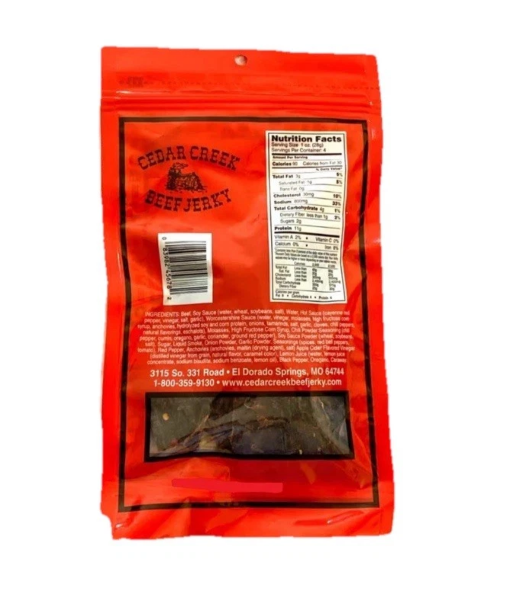 Shop › 6 Pack Ceder Creek Beef Jerky - Hot Image 1 of 4 Image 2 of 4 Image 3 of 4 Image 4 of 4 6 Pack Ceder Creek Beef Jerky - Hot $65.95 You like the heat of the hot cedar Creek Beef Jerky then save money by get a 6 pack. Add To Cart Added! You like the heat of the hot cedar Creek Beef Jerky then save money by get a 6 pack.
